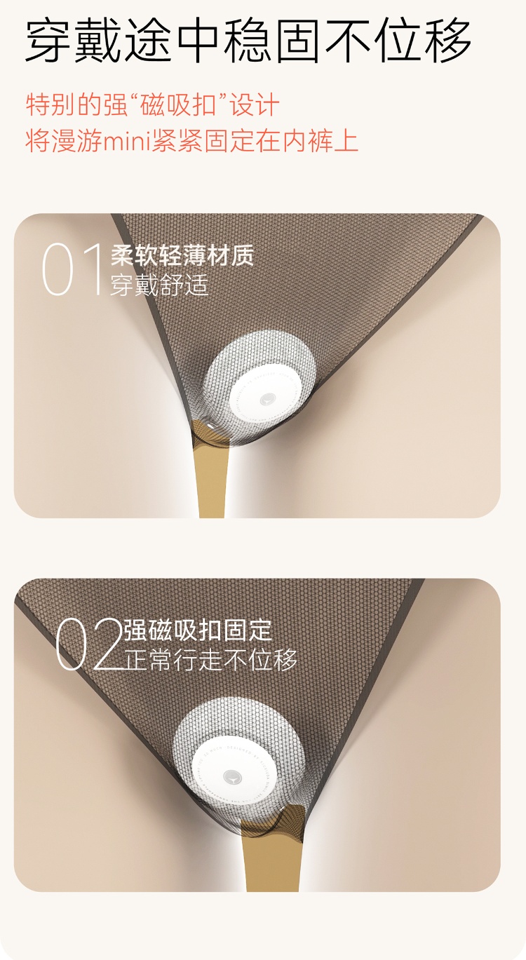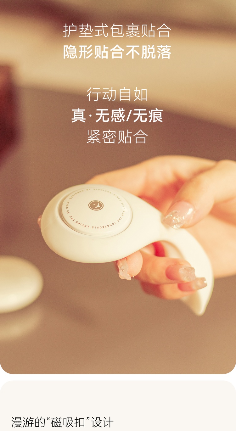 磁吸固定设计,强力吸附内裤,走路 / 运动不移位,外观扁平如护垫,无敏感标识,外穿衣物无痕。
