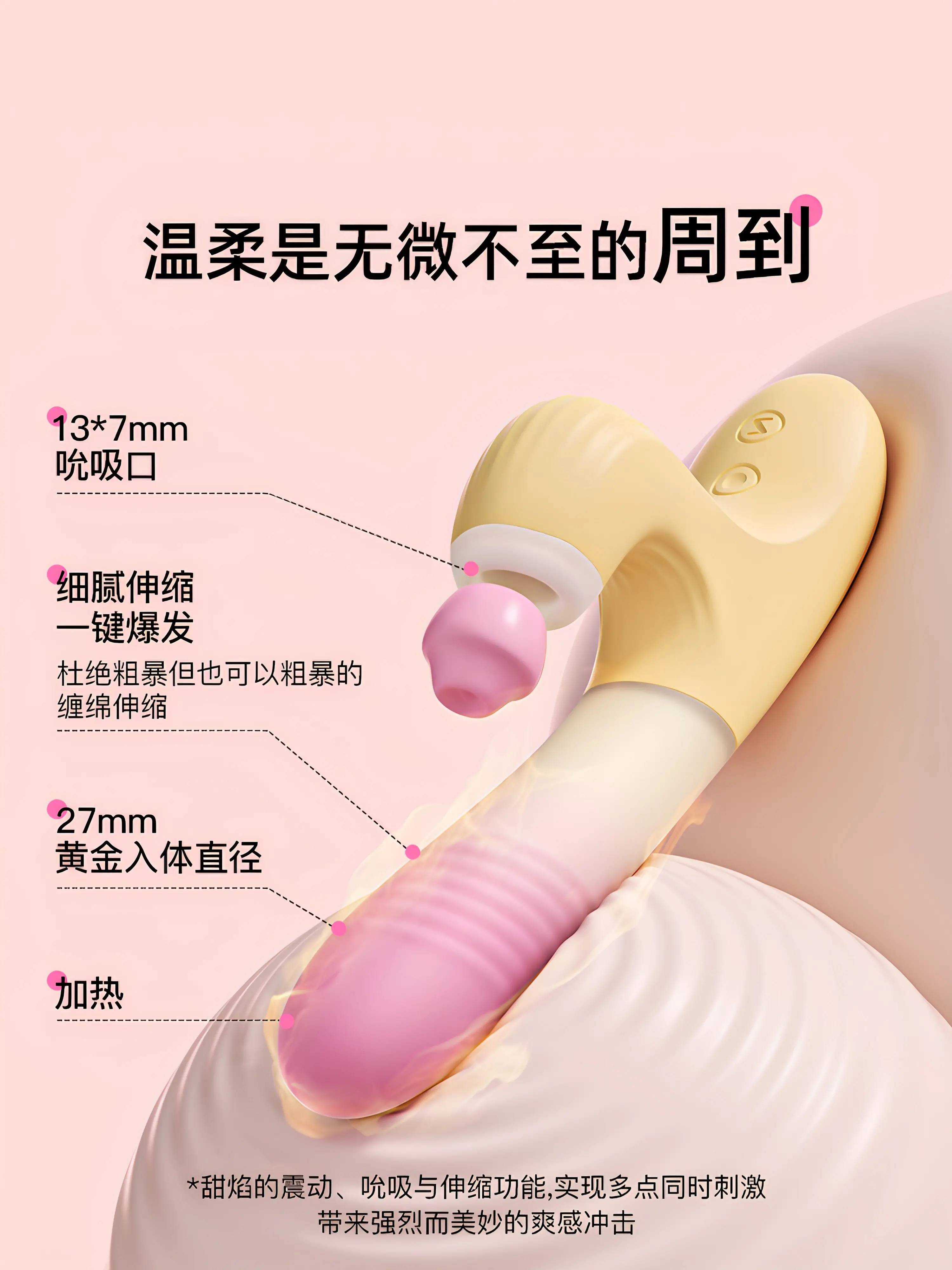 枕木恋甜焰震动棒核心卖点是 “四合一全能:吮吸 + 伸缩 + 加热 + APP 远程”,以 3D 立体吮吸、8 频伸缩、42℃恒温、亲肤硅胶 + ABS 材质为核心,主打内外同享、智能交互与安全私密.